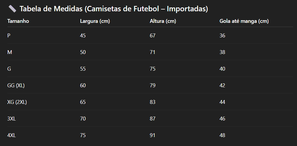 Devido à natureza do produto importado, pode haver limitação para trocas por tamanho.